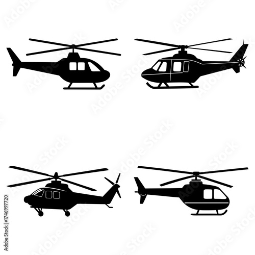 Four black silhouette illustrations of helicopters with rotor blades on a white isolated background view