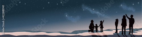 Astronaut explores space being desert planet. Astronaut space suit performing extra cosmic activity space against stars and planets background. Human space flight. Modern vector illustration