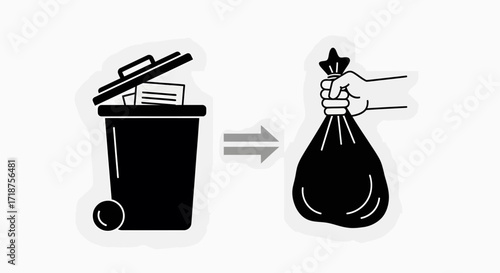 trash bag using steps line art  illustration, an open garbage bag with waste, and a tied full bag useful for cleaning visuals, sanitation guides, or packaging icons.