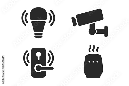Smart home automation solid glyph icon set. Vector illustration of interior features like a smart light switch, voice assistant speaker, and automated blinds. IoT concept.