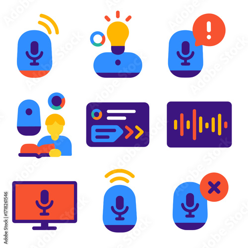 Voice Assistant Icons. Flat icon set of voice assistants in mobile devices: voice search, mobile mic icon,