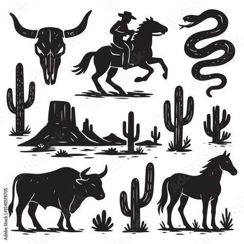 Linocut western boho set vector, Texas desert engraving print collection, vector canyon wildlife, cactus.