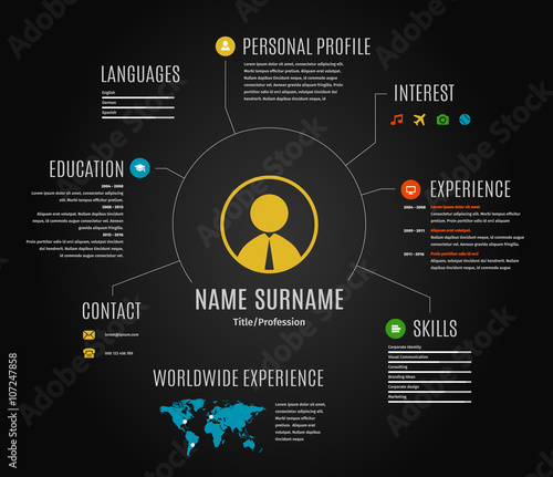 Creative, color rich CV / resume template with circle in the center and place for your personal photo.