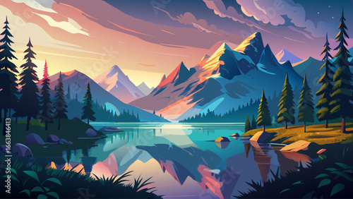 Serene lotus blossoms floating on tranquil water under a dreamy sunset, evoking peace and harmony in this vector art style illustration