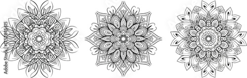 Intricate mandala designs radiating peace and spiritual harmony side by side in bold black line art