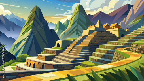 Scenic vector illustration of a Japanese spring landscape with Mount Fuji and a traditional pagoda surrounded by blooming sakura trees at sunrise