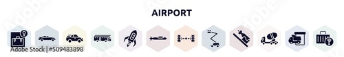 airport filled icons set. glyph icons such as left luggage, car side view, electric car side view, checker, flying rocket, submarine side view, axle, aerial lift, concrete mixer truck icon.