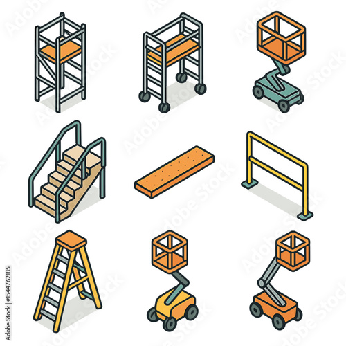 Scissor lifts, boom lifts, aerial work platforms, construction equipment, industrial machinery, maintenance access, height safety, lifting devices, engineering tools, flat vector illustration