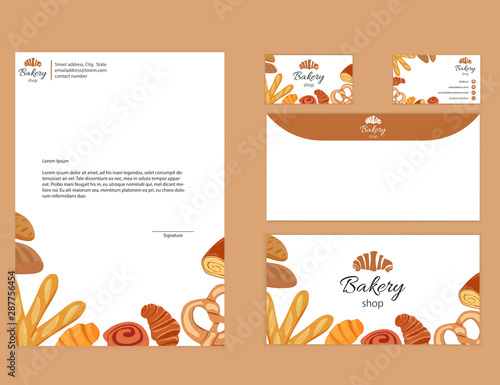 Bakery Shop branding package mock-up set with logo design. Corporate identity mockup. Bakery food cardboard package. Realistic MockUp set of logo, uniform, plastic cup, paper bag, baked goods