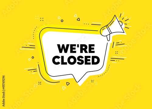 We're closed. Megaphone yellow vector banner. Business closure sign. Store bankruptcy symbol. Thought speech bubble with quotes. Closed chat think megaphone message. Vector