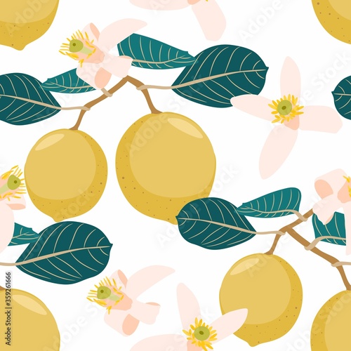 Summer pattern with lemon branch. and jasmine flowers. Background with citrus fruits, vector illustration, print.