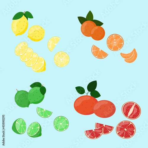 Citrus collection. Set of fresh fruit in flat design. Grapefruit, lime, orange and lemon, isolated on white background. Fresh citrus fruits with shadow. Vector illustration