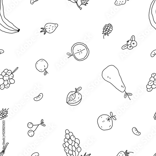 Fruits seamless pattern. Peach banana, cherry, strawberry, apple. Hand drawn line vector illustration.
