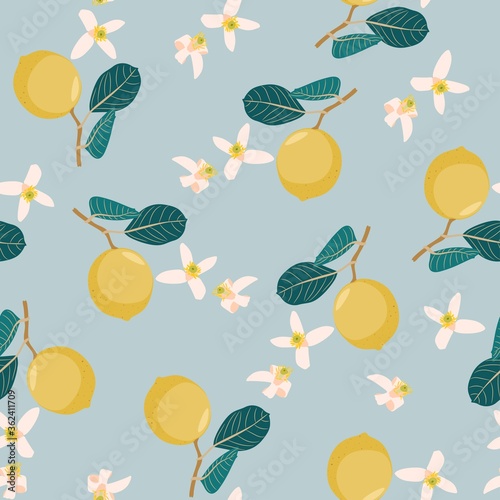 Seamless citrus pattern with palm flowers on blue background. Hand drawn illustration with lemons. Template for print, textile,wallpaper cover and box design.