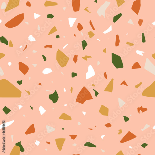 Terrazzo seamless pattern with colorful rock pieces. Abstract backdrop with stone sprinkles scattered on light background. Modern vector illustration for fabric print, wrapping paper, flooring.