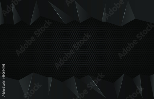 Carbon background. Dark fiber texture. Black geometric metal with shadow. Steel cells design. Realistic composite material. Modern technology backdrop. Vector illustration