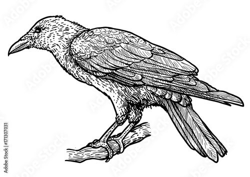 Hand Drawn Illustration of the black Raven bird. High Detailed Vector Art.Black crow cartoon illustration