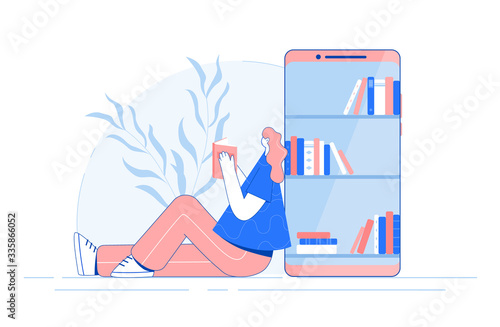Concept of audiobook library. Reader in headphones listens to audio books. Happy girl reads novels, stories with earphones online on phone. Flat isolated vector illustration on white background