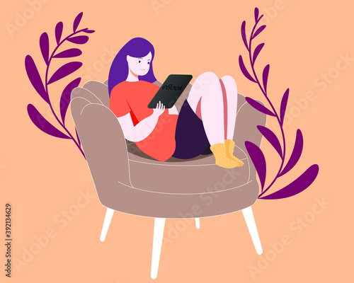 The girl reads her favorite works on the e-book.