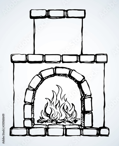 Fireside, home fire place, warm cosy furnace. Fireplace with glowing flames, doors, brick wall. House hearth. Hot indoor decoration. Flat vector illustration isolated on white background
