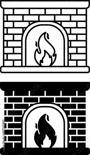 Fireplace Icons. Black and White Vector Icons. Kindling Fire in the Stove. Symbol of Home Comfort. Christmas and Holiday Concept
