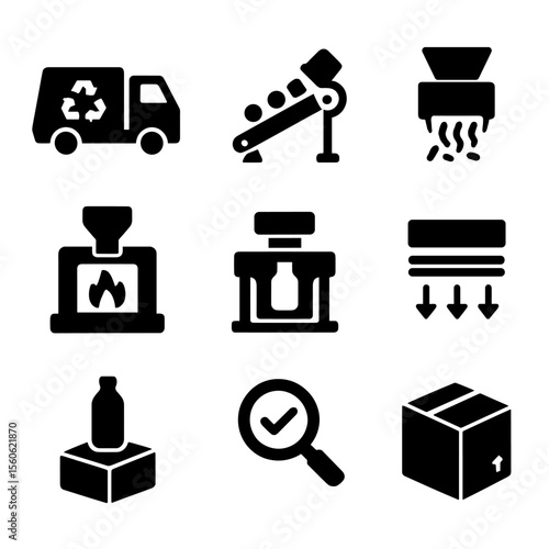 Recycling Process Icons. Solid, filled icon set of recycling process stages: collection truck, sorting conveyor, shredding machine