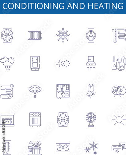 Conditioning and heating line icons signs set. Design collection of Conditioning, Heating, Air, Cooling, Ventilation, Fan, Furnace, Heat outline concept vector illustrations