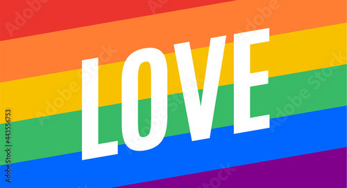 Love, LGBT flag. Poster, banner or Rainbow flag of LGBT. Colorful rainbow lgbt flag for pride. Print for t-shirt of rainbow six colors flag with text Love on background. Vector Illustration