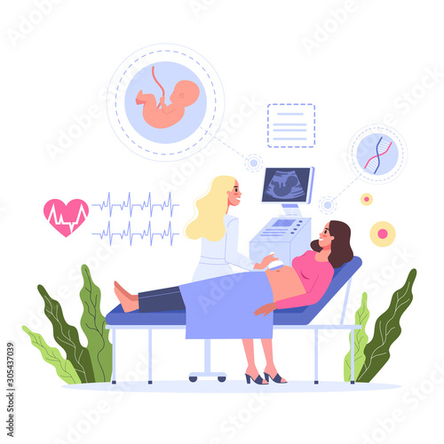 Pregnant woman at the doctor’s appointment. A woman expecting a baby visits a doctor’s office, examination during pregnancy. Flat vector illustration in cartoon design.