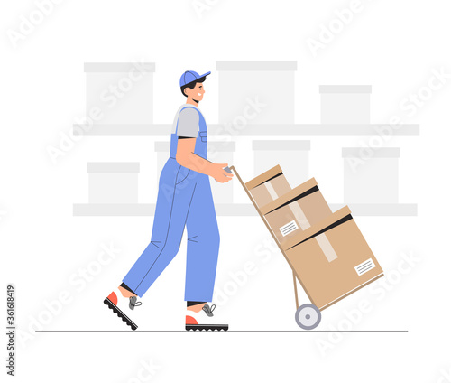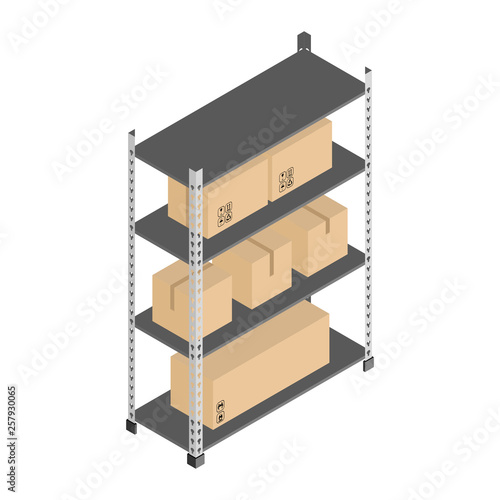 Isometric packed courier on production line against cardboard boxes in warehouse. Transport and processing of orders in trade. Cargo shipment boxes.