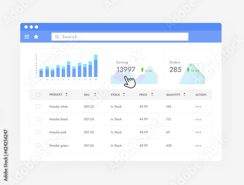 Seller Dashboard - Marketplace Inventory Management concept. Seller interface of e-commerce online store with number of accepted orders and earning money