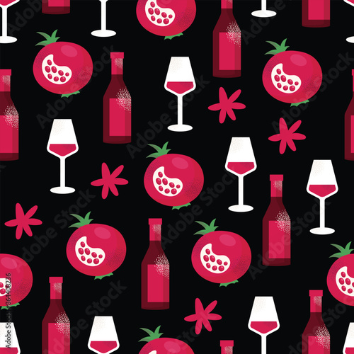 Seamless pattern with Georgian food, wine and fruits. Vector graphics.