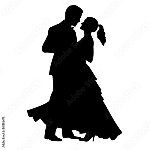 Silhouette of a couple sharing a romantic embrace, the woman in heels and flowing dress, on a white background, love concept. Valentine's day, wedding illustration.