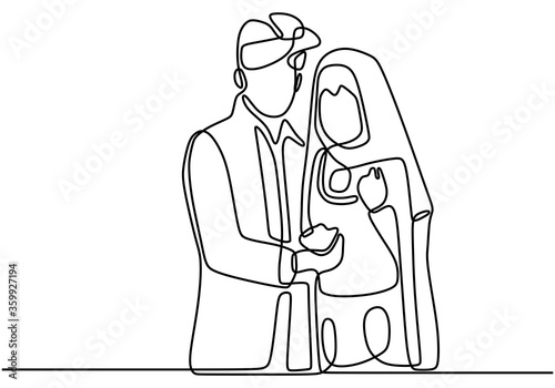 One continuous drawn line wedding drawn from the hand picture silhouette. Happy newly married couple holding hands. The characters of the bride and groom of the husband and wife are married