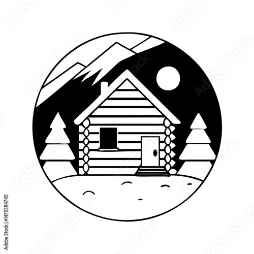 A serene black and white illustration depicts a rustic cabin nestled among snow covered mountains and evergreen trees with hikers and wildlife