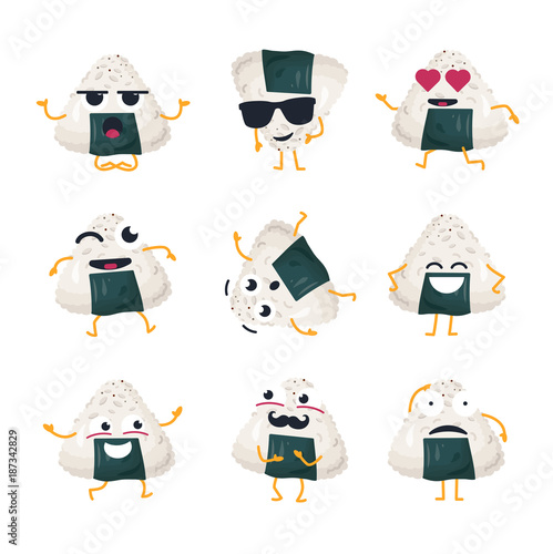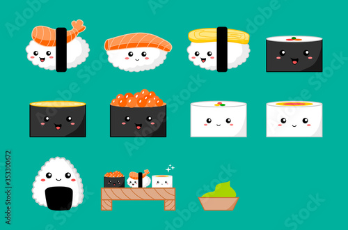 Collection of Cute Sushi and Onigiri Character Icons, Japanese Food Kawaii Style