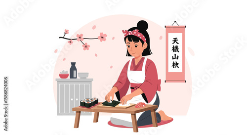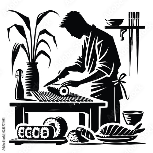 Chef Preparing Sushi on a Plate in an Illustrated and Minimalist Style