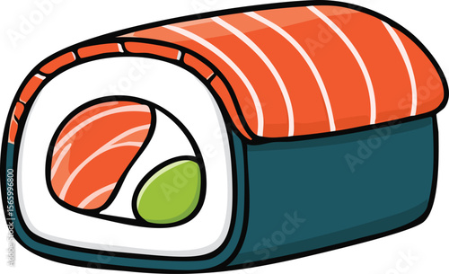 Delicious salmon sushi cartoon illustration with seaweed and rice on a white background