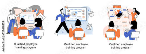 Qualified employee training program. Refresher course metaphor. Help in professional development. Learning for software development and growth. Agile project management team project life scrum meeting