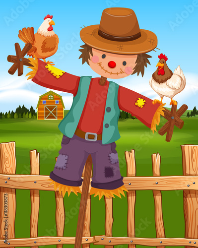 Scarecrow and chickens on the farm