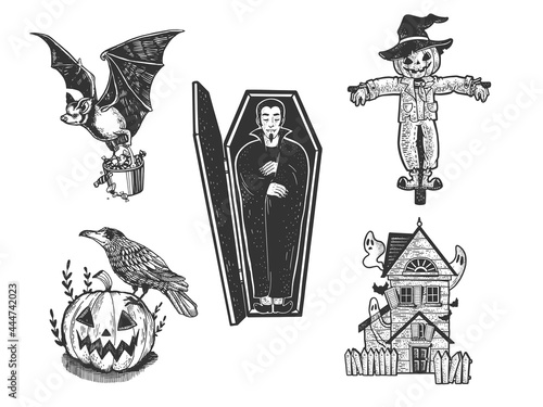 Halloween attributes collection set line art sketch engraving vector illustration. T-shirt apparel print design. Scratch board imitation. Black and white hand drawn image.