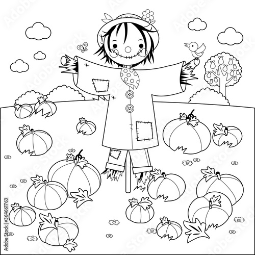 Scarecrow in a pumpkin field. Vector black and white coloring page