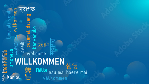 WILLKOMMEN (WELCOME in German) vector word cloud on dark blue background with copy space