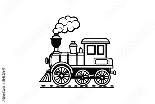 Vintage Steam Train Illustration with Smoke Black and White Vector Graphic for Transportation Nostalgia and Historical Themes Ideal for Logos Designs and Educational Materials