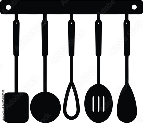 Collection of black kitchen utensil silhouettes on white background fork spoon