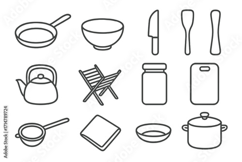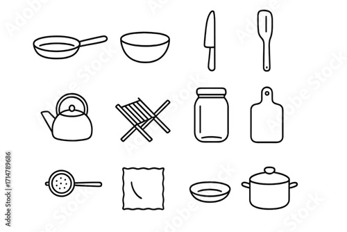 Minimalist Kitchen Icons. Line style icons of minimalist kitchen tools: single frying pan, ceramic bowl, one knife, bamboo spatula