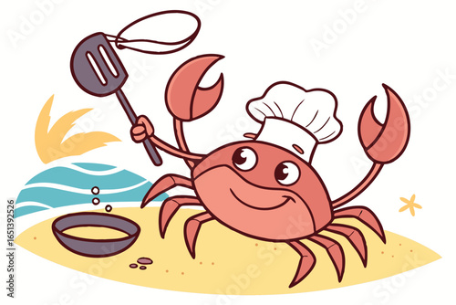 Cute pink chef octopus with a whisk and spatula and a white chef hat