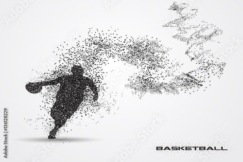 Abstract silhouette of a basketball player on dark black background from particles, dust, smoke, steam. Basketball player jumping and performs slam dunk. Background can be changed to any other. Vector