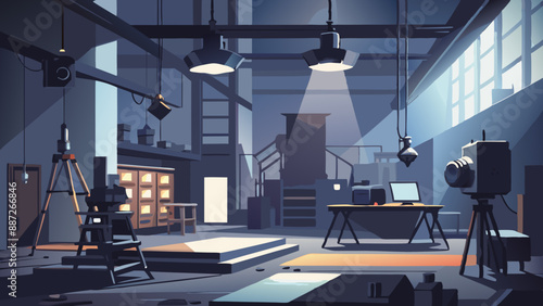 Film shooting location in an industrial setting, featuring professional lighting equipment and a dark backdrop. A moody atmosphere, highlighting the preparation for a film shoot.