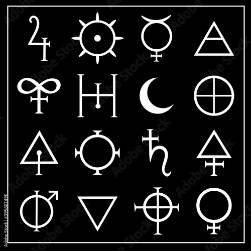 Set of magic and astrological symbols. Mystical signs, silhouettes, zodiac signs, tarot cards. Vector illustration. Witchcraft art. Stickers, banner, decorations. Esoteric aesthetics. Hand drawn.